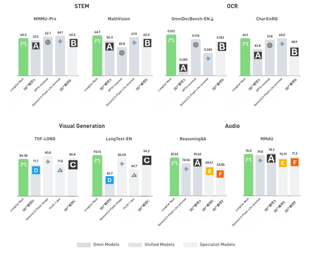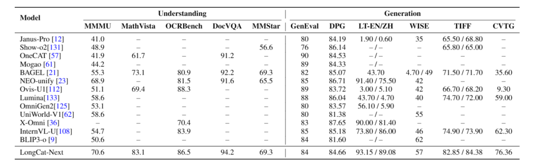 证据之一是,在OmniDocBench这个涵盖学术论文、财报、行政表格等各种复杂文档的多模态基准测试上,LongCat-Next的成绩不仅超越同类多模态模型,还超过了专门做视觉理解的模型。