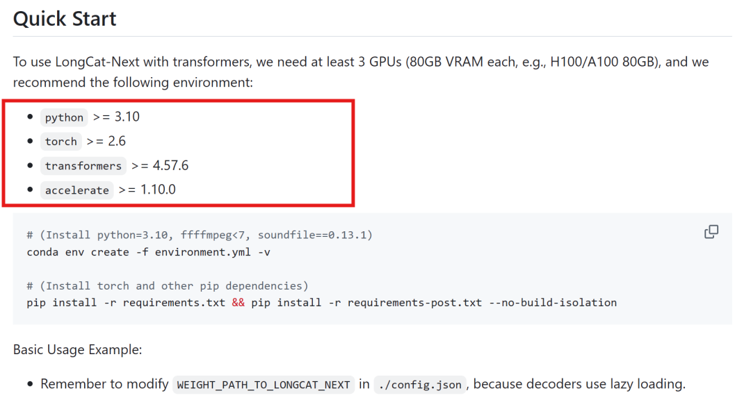 不过要想使用LongCat-Next,除了硬件上需要至少3张80GB显存的专业显卡(如英伟达A100/H100),软件配置要求如下: