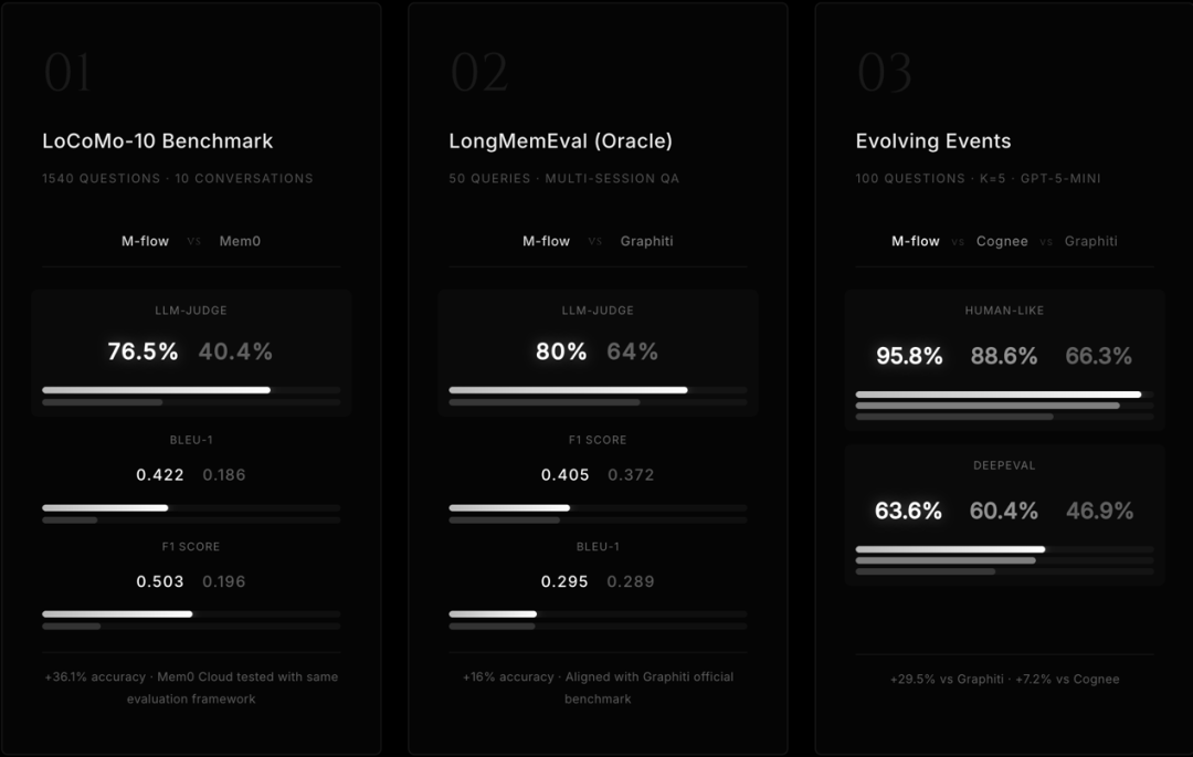 对齐Mem0的官网benchmark测试(LoCoMo),领先Mem0 36%; 对齐Graphiti的官网benchmark测试(LongMemEval),领先Graphiti 16%; 在长期事件演变测试(EvolvingEvents)中,领先Cognee 7%,领先Graphiti 20%。