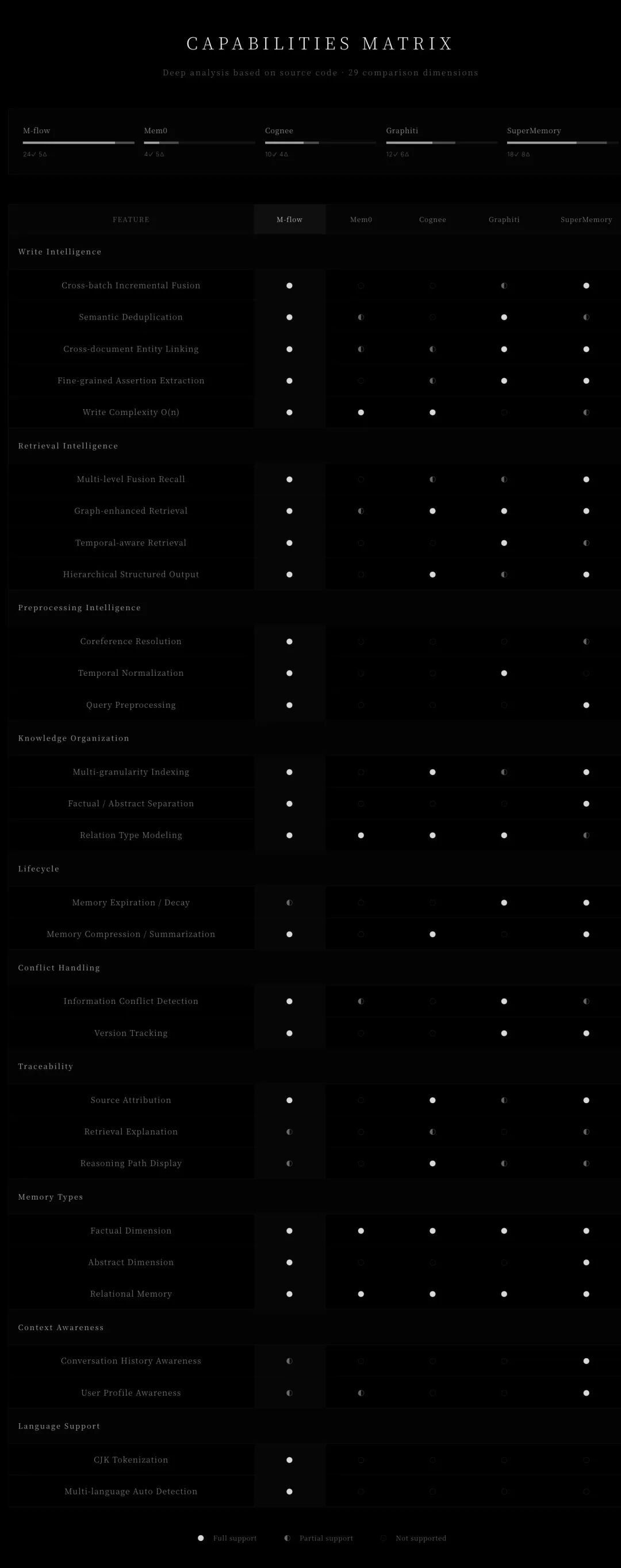 深度测评之后,可以更清晰地看到在覆盖写入、检索、预处理、知识组织等环节等29项能力维度中,M-FLOW在绝大多数关键维度上都实现了完整支持。(下图可上下滑动完整查看)