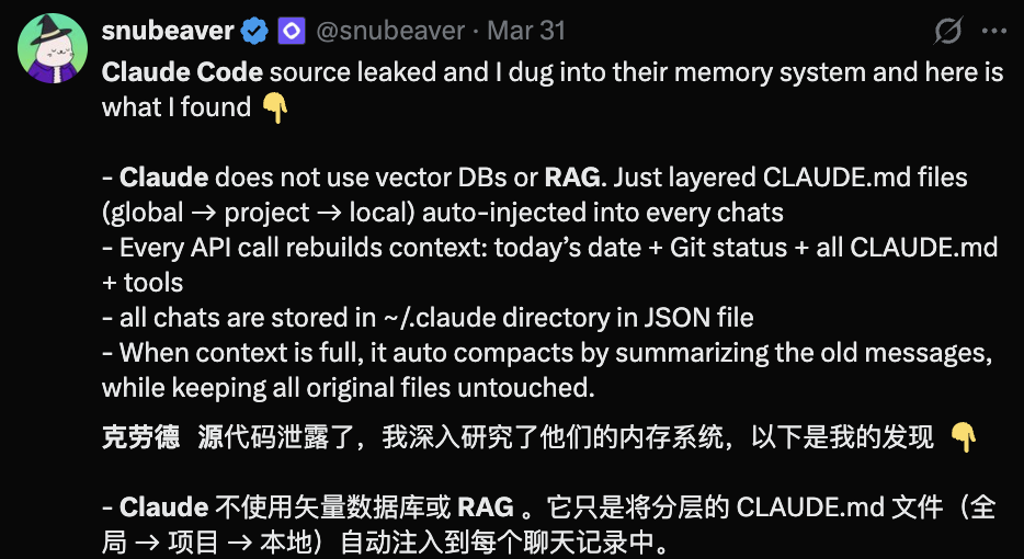 说起来还挺反常,Claude几乎Contribute了所有RAG记忆项目,结果泄露的代码却显示——