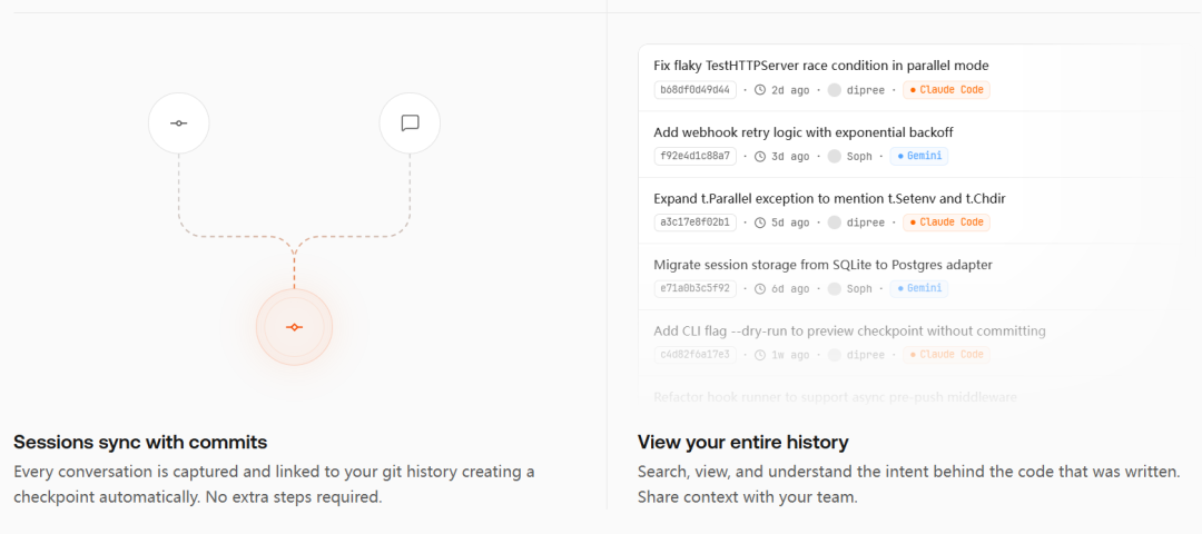 有了Entire CLI,每次提交都可以不仅追溯到代码差异,还能检查产生它的推理过程。这意味着代码评审时,能关注大模型推理时产生的意图和约束,而不仅仅是修改的那几行代码。