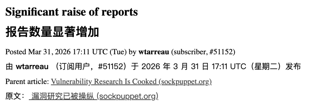 唯一的解释就是:现在有一大堆本来不是搞安全的人,都开始用AI来找漏洞了。