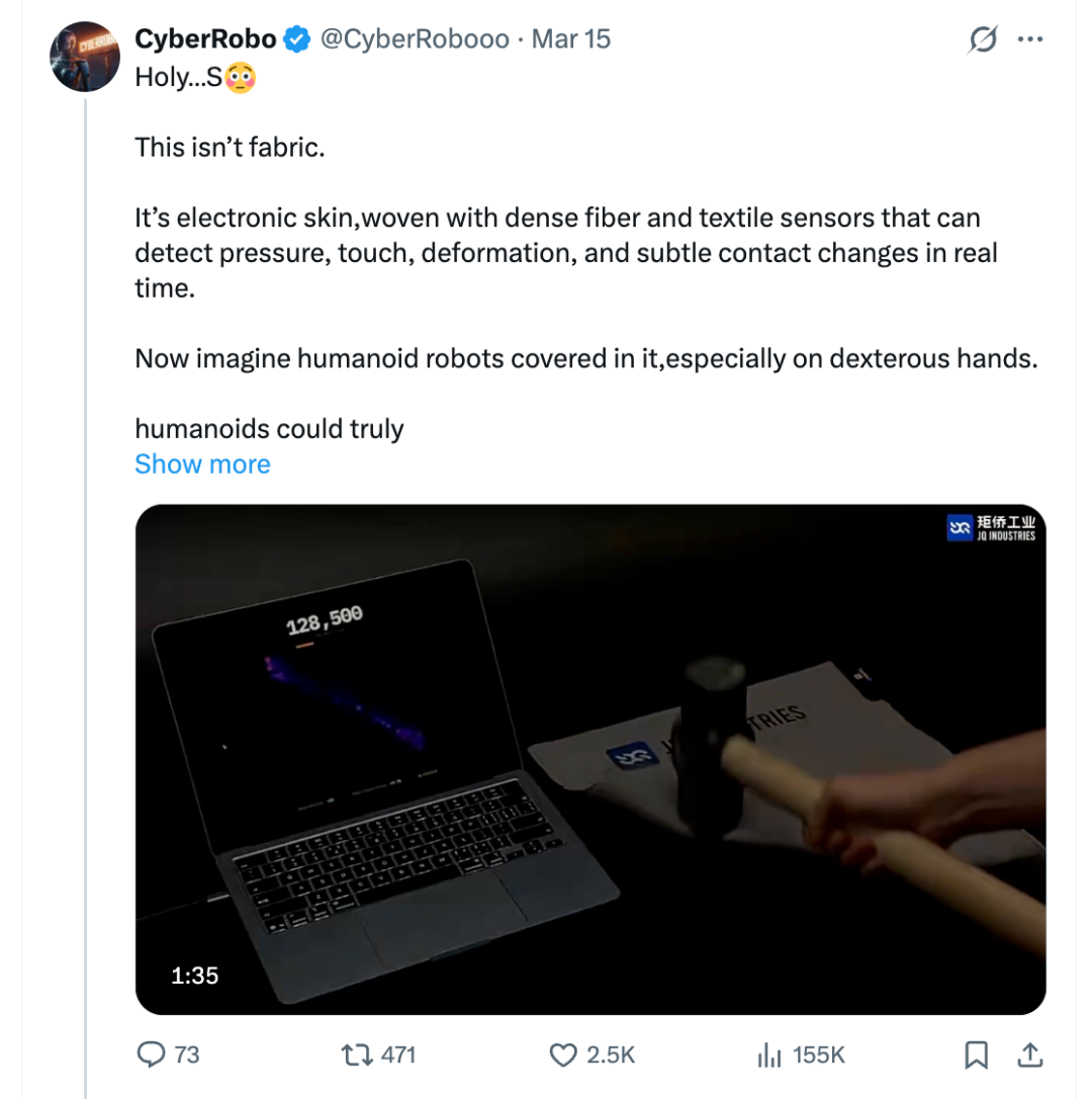 2025年,他们在B站发布了《做了一件有触觉的衣服》《做了一副有触觉的手套》等一系列视频,详细展示了机器人穿上电子皮肤的玩法。