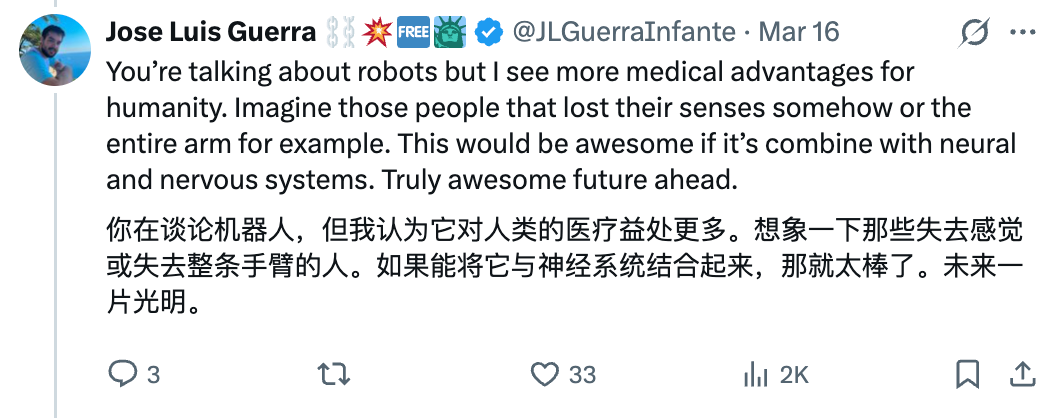 它对人类医疗也有好处,比如帮助那些丧失神经感知或失去整条手臂的人重新找回触觉。