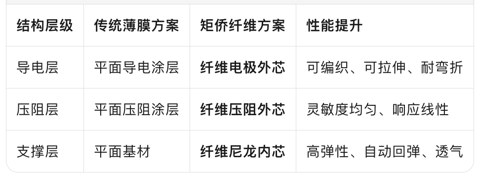 而矩侨的创新方案将三层结构完全解构为纤维化形态:纤维尼龙内芯+纤维压阻外芯+纤维电极外芯。