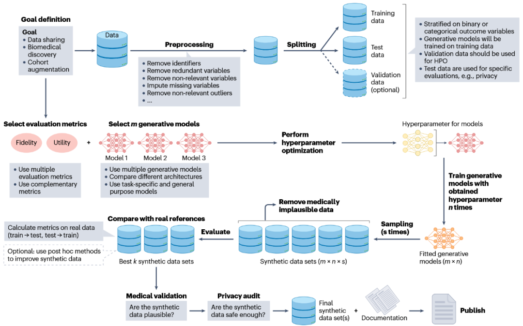 在训练前通过过采样、剔除异常值等方式减轻偏差,应定义硬性约束以捕捉医学上不合逻辑的记录,例如不可能的实验室数值或不相容的临床特征组合。此外,使用多种生成模型和超参数优化,进行多次训练与采样以获取候选数据集。使用真实数据子集作为基准,筛选出接近真实-真实比较水平的合成数据。由于合成数据的生成本质上是迭代的,未达到预期标准的数据集应返回到先前的步骤。这可能涉及重新审视预处理选择、考虑额外的生成模型、执行更广泛的超参数优化,或改进评估指标以更好地捕捉与真实数据的一致性。此外,可以采用事后方法提高生成后合成数据集的可用性(图2)。
