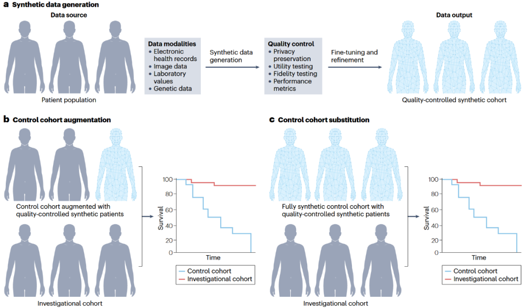 创建对照组的传统方法正日益受到异质性、代表性不足、不一致性、监管限制以及对照组治疗方案过时等问题的限制。此外,如果现有的真实世界数据不符合试验要求,或者无法获取或负担不起,那么使用真实世界数据来扩充或替代对照队列是不可行的。而合成对照可以大规模生成,无需在对照组中进行大规模患者招募,这有可能加快试验进程,降低成本,并促进更快的监管申报和药物批准(图1)。多项研究验证了合成对照在多种癌症类型中的可行性,也指出其对训练数据质量和模型选择的依赖性。