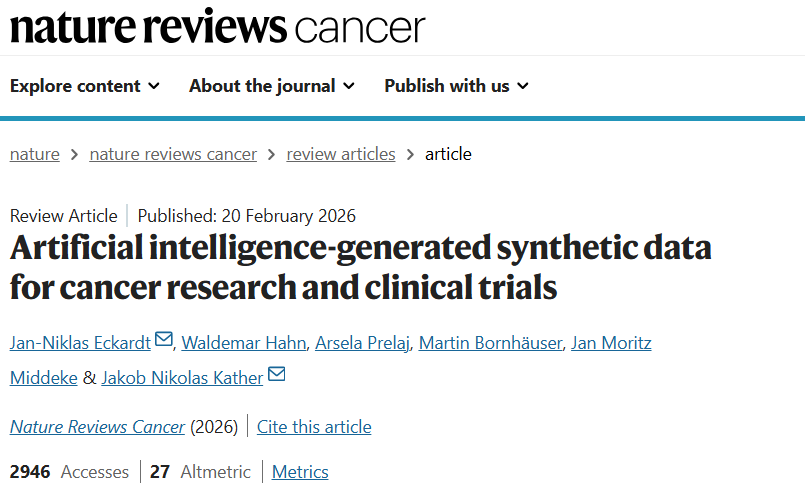 针对上述话题,德累斯顿工业大学、意大利综合癌症中心Fondazione IRCCS Istituto Nazionale dei Tumori机构的研究人员于2026年2月20日在《Nature Reviews Cancer》上发表综述文章,题为“Artificial intelligence-generated synthetic data for cancer research and clinical trials”。