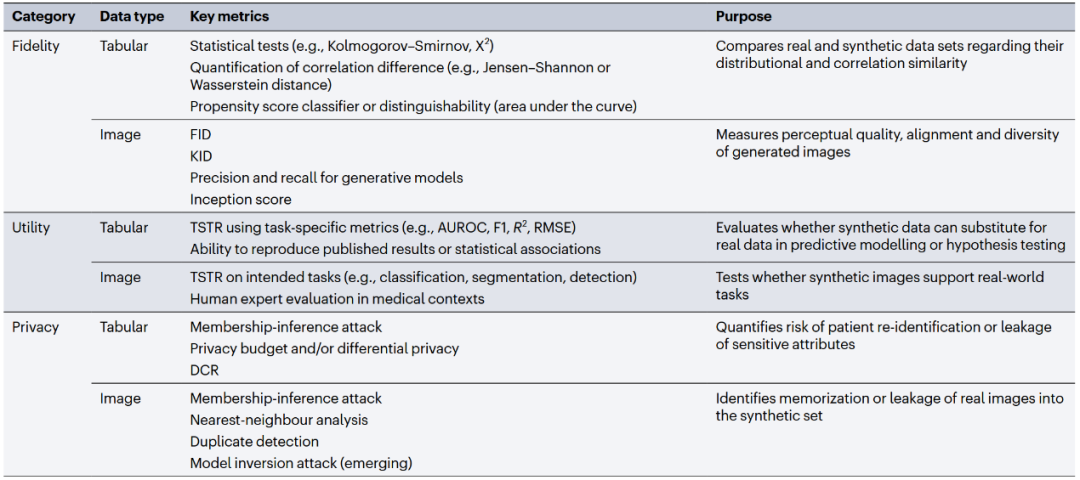 目前,合成数据生成的质量保证尚缺乏标准化。通常,需要对保真度、可用性和隐私保护进行评估。保真度(或相似性)指的是合成数据模仿统计分布和变量间关系的程度,通常通过统计方法进行评估。可用性(或实用性)评估合成数据在下游任务中的表现是否与真实数据相似。由于健康数据包含敏感信息,合成数据必须保护患者隐私,并降低重新识别和数据隐私泄露的风险。表1展示了图像和表格数据合成中的常用评估指标。