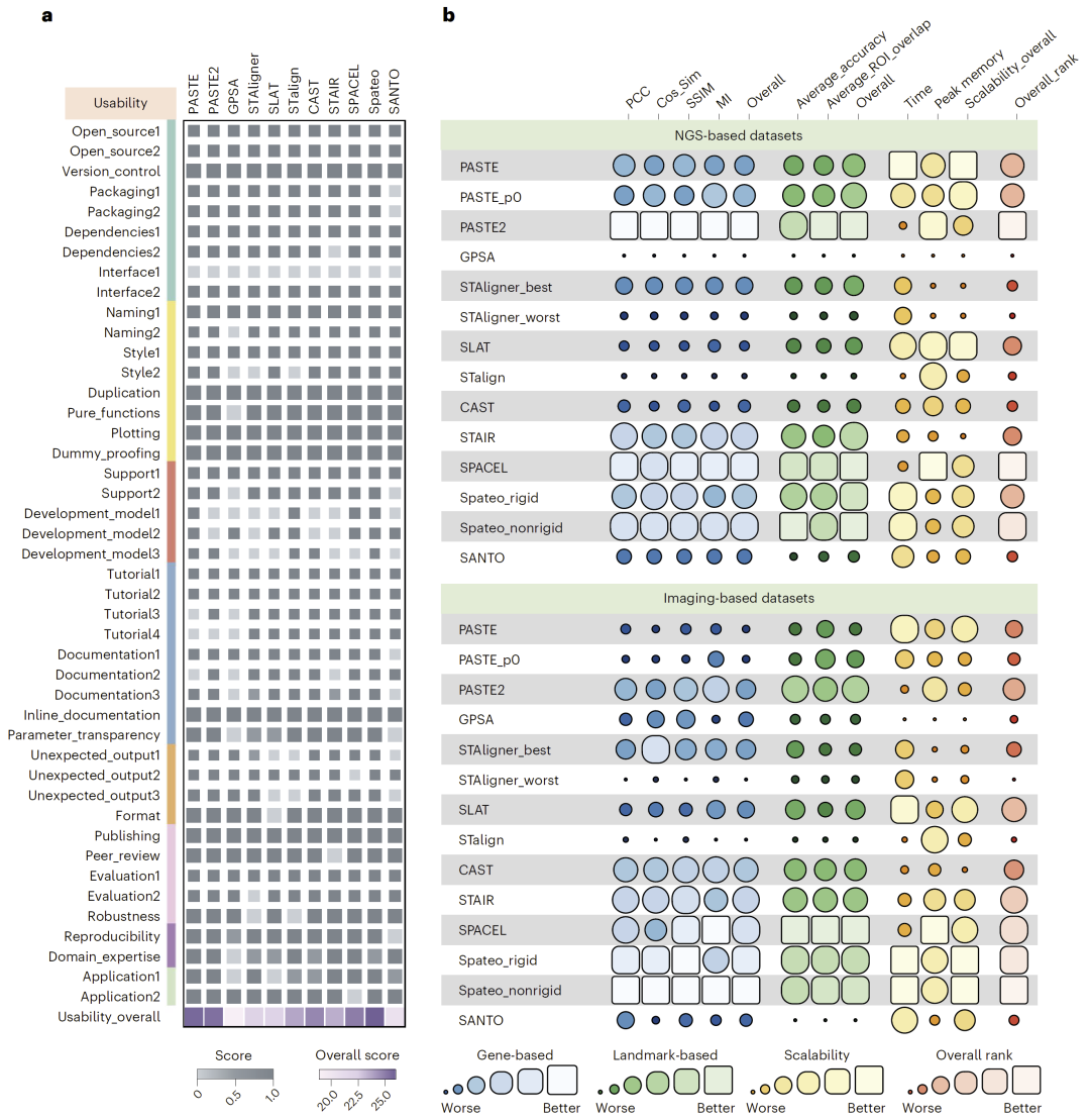 本研究系统评估了空间转录组数据对齐方法的性能,并揭示了不同方法在多种场景下的优势与局限。研究结果表明,尽管已有方法在常规任务中表现良好,但在复杂真实应用中仍面临诸多挑战,例如鲁棒性不足和计算成本过高。