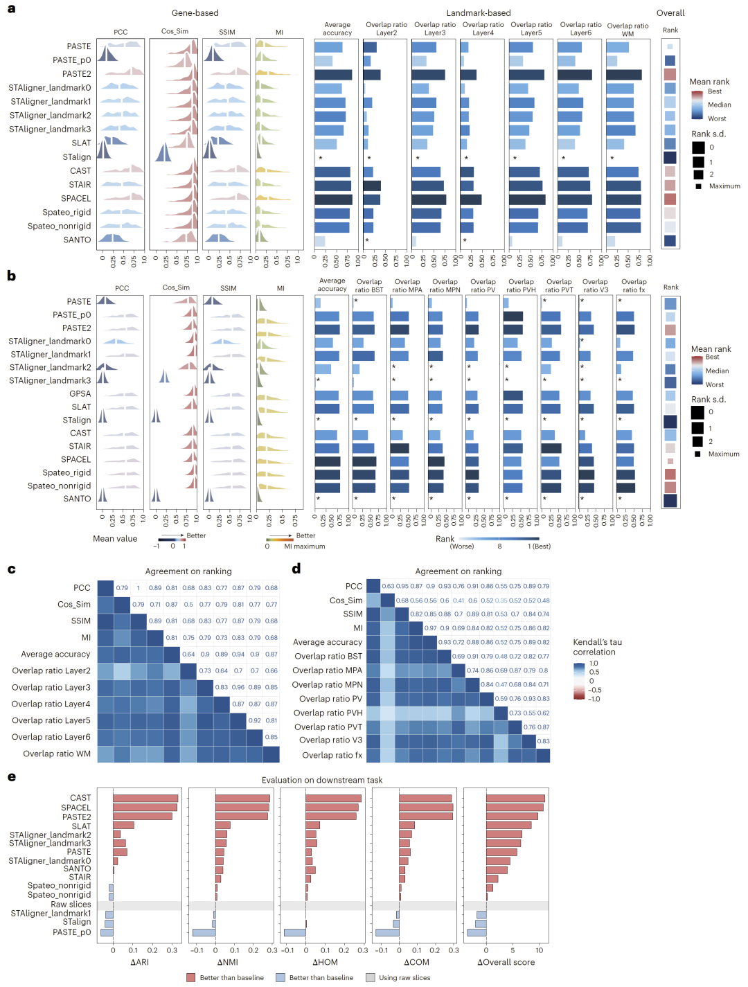 研究人员比较了11种主流空间对齐方法,这些方法大多以基因表达矩阵和空间坐标为输入,通过线性、非线性或混合变换实现切片对齐。最终输出通常为新的空间坐标或匹配点对,并将多个切片整合至统一三维空间。