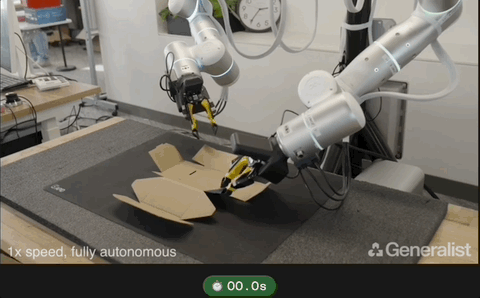 以前折叠一个标准纸箱需要慢悠悠地磨掉34秒,现在GEN-1仅用12.1秒就能完成,效率直接开启了3倍速模式。