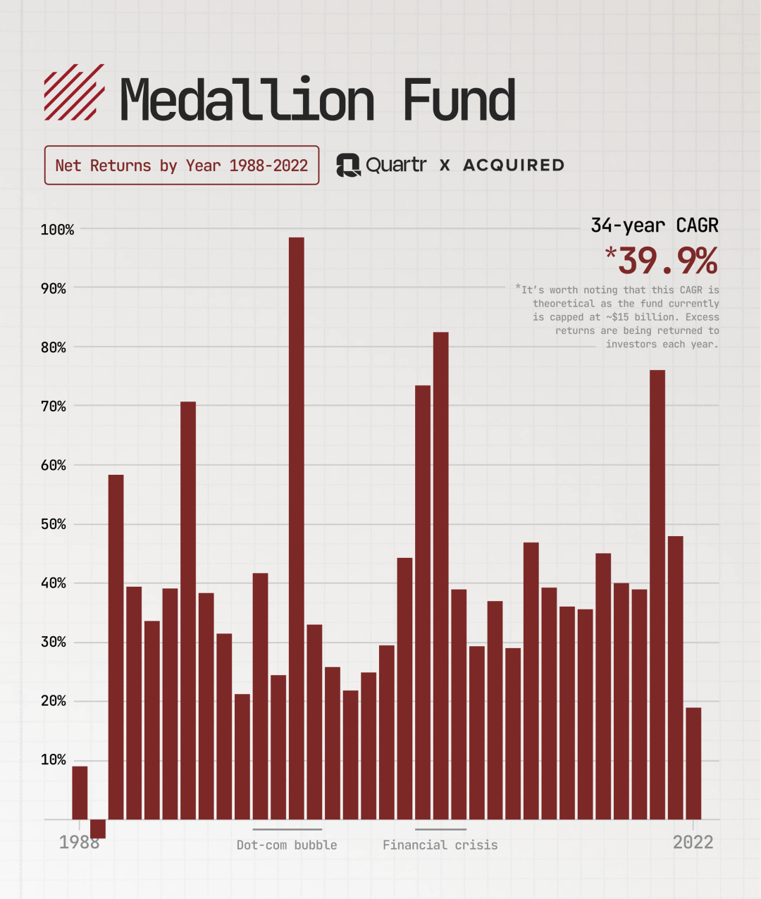 大奖章基金1988-2022年净回报率:34年复合年化增长率39.9%。