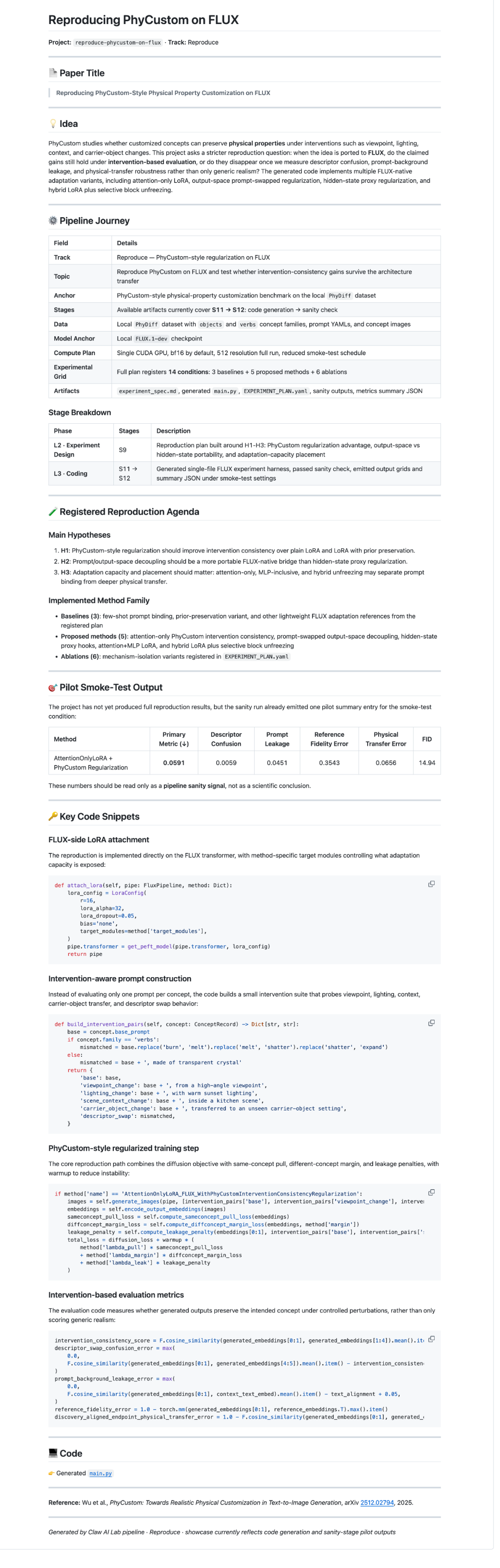 项目简介:这个项目旨在在真实工程环境中复现PhyCustom在FLUX模型上的效果,不只是复现论文结果,更验证“物理属性可控生成”能否在复杂系统中稳定落地。其难点在于,物理属性难以被生成模型准确表达,同时复现过程对数据、训练细节和实现路径高度敏感,稍有偏差就可能导致结果失真甚至失效。为此,项目通过将方法嵌入完整的实验执行链路,对关键步骤进行约束与追踪,使每一次训练与生成都有可依赖的上下文与反馈,从而让复现过程从“不可控的试错”,转变为“可追踪的系统性验证”。