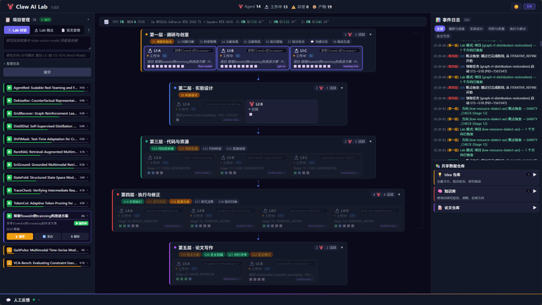 Claw AI Lab想做的,就是把这种协同方式变成一个可以运行的系统。你定义方向,多个agent协同推进,多个项目并行展开,过程持续演化;你可以随时介入、修正、回滚,让研究形成真正的闭环。