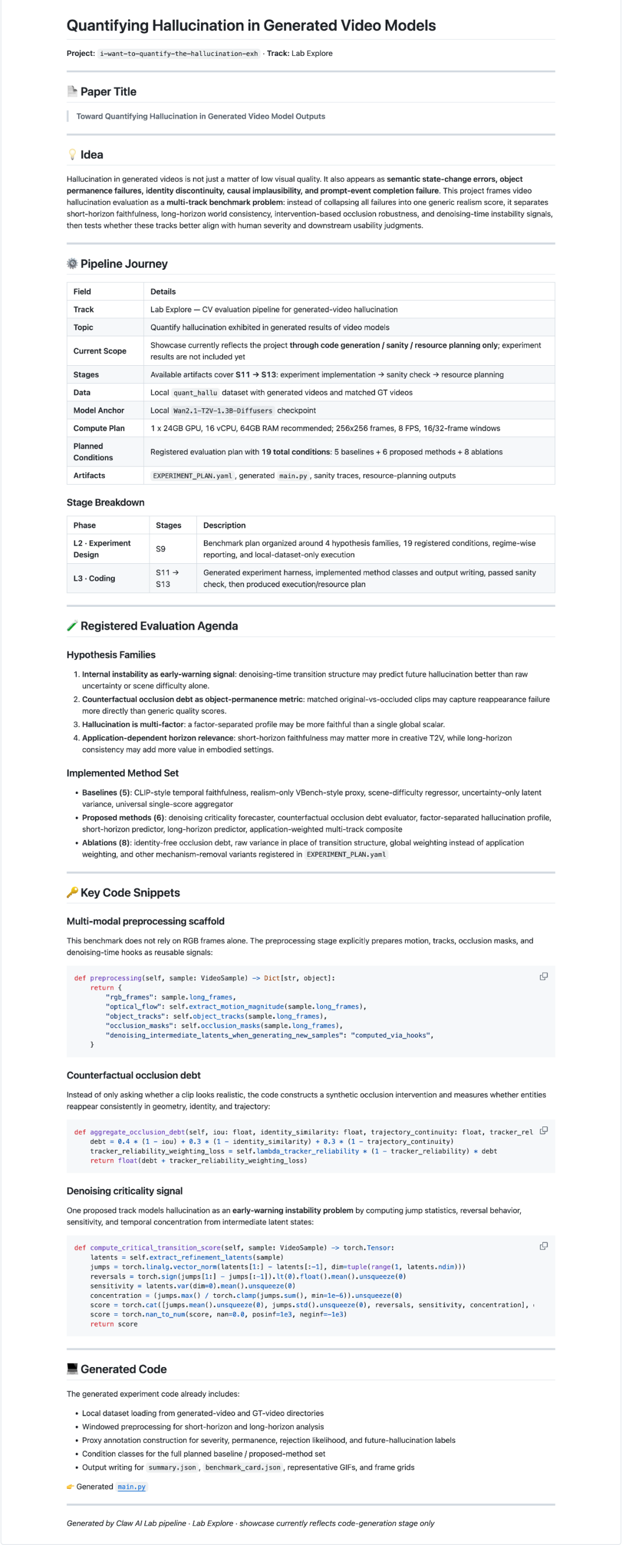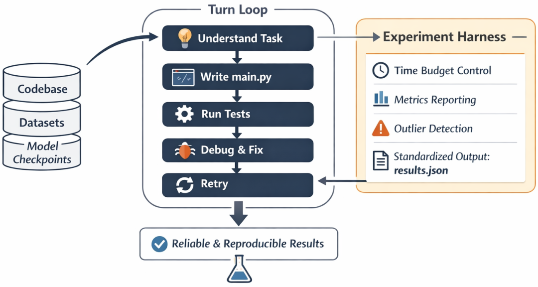 更关键的是,系统会在运行环境中注入一个不可编辑的Experiment Harness,统一负责时间预算控制、指标上报、异常值校验,以及最终生成标准化的results.json。这意味着Claw不只是“会写代码”,而是在建立一条从想法到实验结果的可信执行链路,让AI生成的不是demo,而是真正能落地、能复现、能被继续优化的研究代码。
