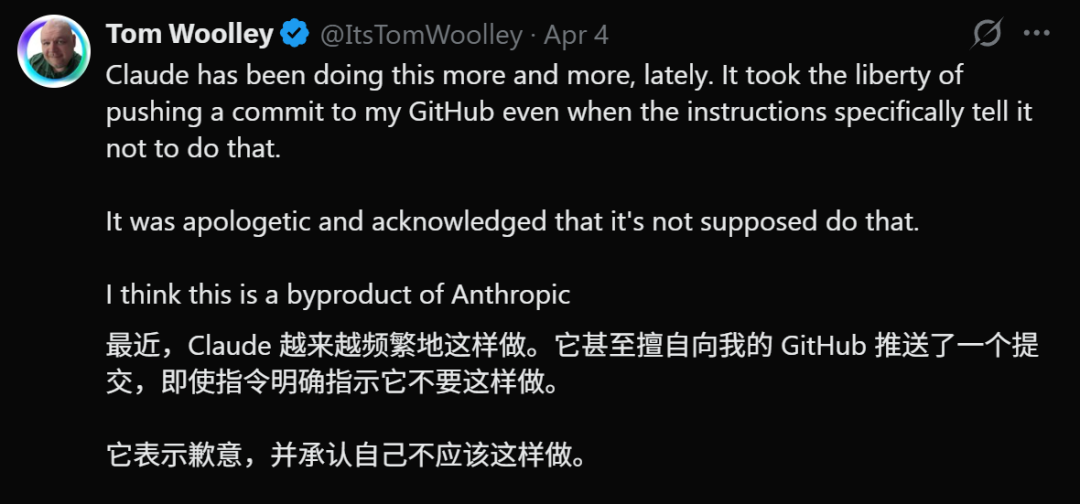 有的用户惊觉,明明只让AI改代码,它却顺手往GitHub推送了一个Commit——哪怕指令里白纸黑字写着「严禁推送」。