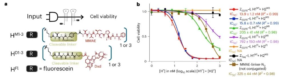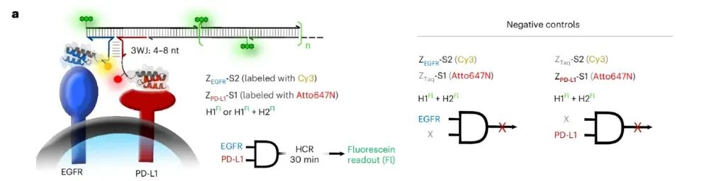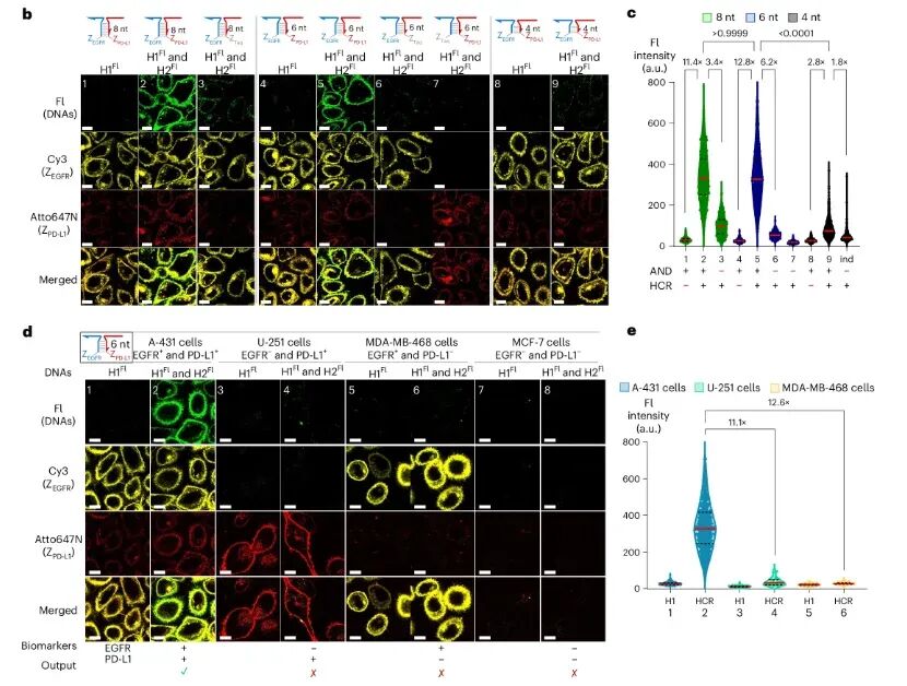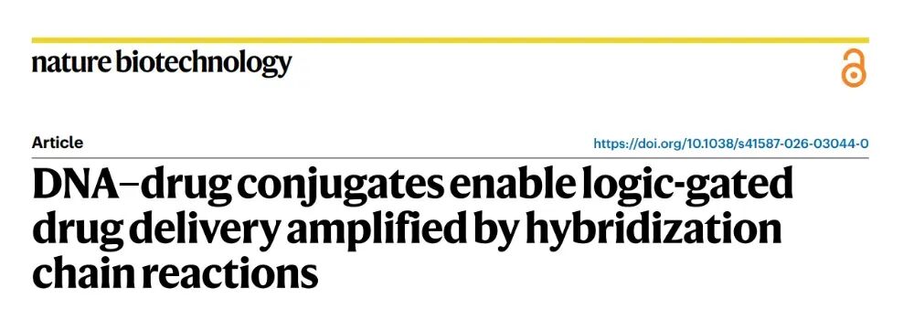 2026 年 3 月27日,《Nature Biotechnology》在线发表了日内瓦大学 Nicolas Winssinger 团队的突破性研究“DNA–drug conjugates enable logic-gated drug delivery amplified by hybridization chain reactions”。他们打造了一套全新的DNA - 药物偶联物(DDC)系统,给抗癌药物装上了可编程的 “逻辑芯片” 和 “信号放大器”,一举突破了当下抗体-药物偶联物(ADC)的核心临床瓶颈,为实体瘤精准治疗、个性化抗癌疗法打开了全新的大门。在癌症靶向治疗领域,ADC素有 “生物导弹” 之称,是当下最热门的抗癌疗法之一。它将能精准识别肿瘤的单克隆抗体、强效杀伤细胞的化疗药物,通过特殊连接子拼接在一起,实现 “精准导航 + 定点爆破”,已经在多种血液肿瘤和实体瘤中取得了临床成功。但风光之下,ADC在实体瘤治疗中始终面临着三大难以突破的痛点:实体瘤穿透能力差:IgG抗体分子量高达150 kDa,难以穿透致密的肿瘤基质,往往只能聚集在肿瘤外围,无法深入瘤体发挥药效;载药量天花板明显:主流的二代ADC仅能携带 2-4 个药物分子,即便是临床大获成功的德曲妥珠单抗,药物抗体比也仅7-8,进一步提升载药量极易影响抗体的靶向性;特异性仍有短板:多数ADC仅依赖单靶点识别,一旦正常细胞低表达该靶点,就可能被误伤,带来不可避免的毒副作用。DDC+HCR:给抗癌药装上 “双密码锁”+“超级放大器”研究团队跳出了传统 ADC 的框架,将 DNA 纳米技术的可编程性、亲和体 / 适配体的精准靶向性,与杂交链式反应(HCR)的信号放大能力完美结合,打造了一套逻辑门控的 DNA - 药物偶联物递送系统。这套系统就像一台精密的 “抗癌智能计算机”,核心分为三大模块,每一步都实现了对传统 ADC 的颠覆:团队放弃了传统的大分子量抗体,转而选用亲和体(<10 kDa) 和核酸适配体作为靶向元件。它们的分子量仅为抗体的 1/15,却保留了不输抗体的高亲和力和特异性,能轻松穿透肿瘤基质,从根源上解决了实体瘤渗透难的问题。2. 双靶点 “AND 逻辑门”,只认肿瘤细胞的 “双密码锁”这是这套系统最精妙的设计之一。研究人员将触发后续反应的 HCR 启动子拆成了两半,分别连接在靶向两种不同肿瘤生物标志物(如 EGFR、PD-L1、PTK7)的亲和体 / 适配体上。只有当两个肿瘤标志物同时存在于同一个细胞表面时,拆分的两段启动子才会在细胞膜上靠近并组装成完整的启动序列,就像一把需要两把钥匙同时转动的密码锁,只有真正的肿瘤细胞才能解锁后续反应。团队通过实验验证,6 个核苷酸(nt)长度的三向连接结构,能在保证反应效率的同时,实现最低的背景泄露,让 “双密码锁” 的精准度达到了极致。3. HCR 链式反应,超百倍放大的 “药物弹药库”完整的启动子一旦形成,会立刻触发杂交链式反应(HCR):大量携带化疗药物的 DNA 发夹结构,会像滚雪球一样在肿瘤细胞膜上发生链式自组装,形成长链聚合物。这个过程实现了惊人的信号放大:在细胞实验中,这套系统实现了最高 217 倍的扩增效率,相比输入的生物标志物,靶向递送的药物信号放大超 100 倍。更重要的是,每个 DNA 发夹都能携带 1-3 个化疗药物分子,一次 HCR 反应就能在肿瘤细胞表面富集海量药物载荷,彻底打破了传统 ADC 的载药量天花板。当 DNA - 药物长链组装完成后,会被肿瘤细胞高效内吞,在细胞内的溶酶体中,通过组织蛋白酶可切割的连接子释放出化疗药物,完成对肿瘤细胞的精准杀伤。b 图:通过显微成像,比较分裂引发剂中 3WJ 长度(4 nt、6 nt、8 nt)对 A-431 细胞 HCR 性能与特异性的影响。c 图:整合 b 图 9 种条件及额外 1 组条件下各细胞膜荧光强度,统计对应细胞数量与生物学重复数,基于中位数计算倍数,采用 Kruskal–Wallis 检验及双尾 Dunn 事后检验分析 P 值。d 图:检测不同生物标志物组合的癌细胞系中,AND 门控响应的特异性。e 图:整合 d 图 6 种条件下细胞膜荧光强度,标注部分条件未定量原因,统计细胞数、生物学 / 技术重复,统计方法同 c 图这项研究不仅完成了技术原理的验证,更通过多组细胞实验,证明了这套 DDC 系统在临床应用中的巨大潜力,每一项突破都直击当下癌症治疗的痛点:双靶点 AND 逻辑门的设计,让这套系统只对同时表达两种标志物的肿瘤细胞发挥作用。在混合细胞培养实验中,治疗组仅对靶标肿瘤细胞实现了高效杀伤,而共培养的正常细胞增殖完全不受影响,几乎没有出现传统化疗 / ADC 常见的 “旁杀伤效应”,极大降低了治疗的毒副作用。实验发现,携带 3 个 MMAE(经典 ADC 细胞毒药物)的 DNA 发夹,能让 HCR 产物的细胞内吞效率提升 10 倍以上,杀伤效果是单药物分子发夹的 50 倍。这种设计让 “低剂量给药、高药效杀伤” 成为可能,在提升治疗效果的同时,进一步降低了全身毒性。这套系统的模块化设计,让药物递送拥有了无限可能。研究人员在不同的 DNA 发夹上分别偶联了 MMAE 和 Dxd(德曲妥珠单抗的核心药物),成功实现了两种不同化疗药物的联合精准递送。这意味着,未来可以根据患者的肿瘤特征,定制化搭配不同的药物组合,应对肿瘤异质性和化疗耐药性,真正实现 “一人一方” 的个性化抗癌治疗。除了直接递送化疗药物,研究团队还解锁了这套系统的另一大潜力:通过 HCR 反应,在肿瘤细胞表面特异性招募抗体。实验证实,HCR 形成的 DNA 长链能以极高的亲和力捕获抗体,这为抗体依赖的细胞毒性(ADCC)、靶向免疫降解等免疫治疗策略提供了全新平台,让这套系统不止能直接杀伤