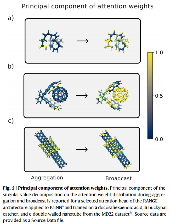 RANGE 使用加性注意力(additive attention,而非点积注意力)机制,理论上具有更强的可解释性。对 DHA、CC、DW 三个体系,对每个注意力头的权重矩阵进行奇异值分解(SVD),取最大奇异值对应的奇异向量映射至图节点。