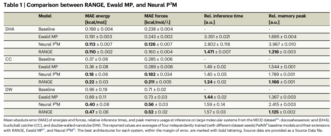 • 精度:RANGE 与 Neural P³M 精度相当,均显著优于 Ewald MP 和基线; • 推理效率:RANGE 在所有体系中推理时间开销最低(1.2-1.6×),而 Neural P³M 在 DHA 上高达 2.8×; • 内存效率:RANGE 内存峰值增量始终低于 1.25×,Neural P³M 在 DHA 上高达 4×; • MD 可行性:Neural P³M 的 FFT 网格需在每个 MD 步重建,在大体系 MD 模拟中内存不可行;RANGE 无此问题,可直接用于长时 MD 模拟。