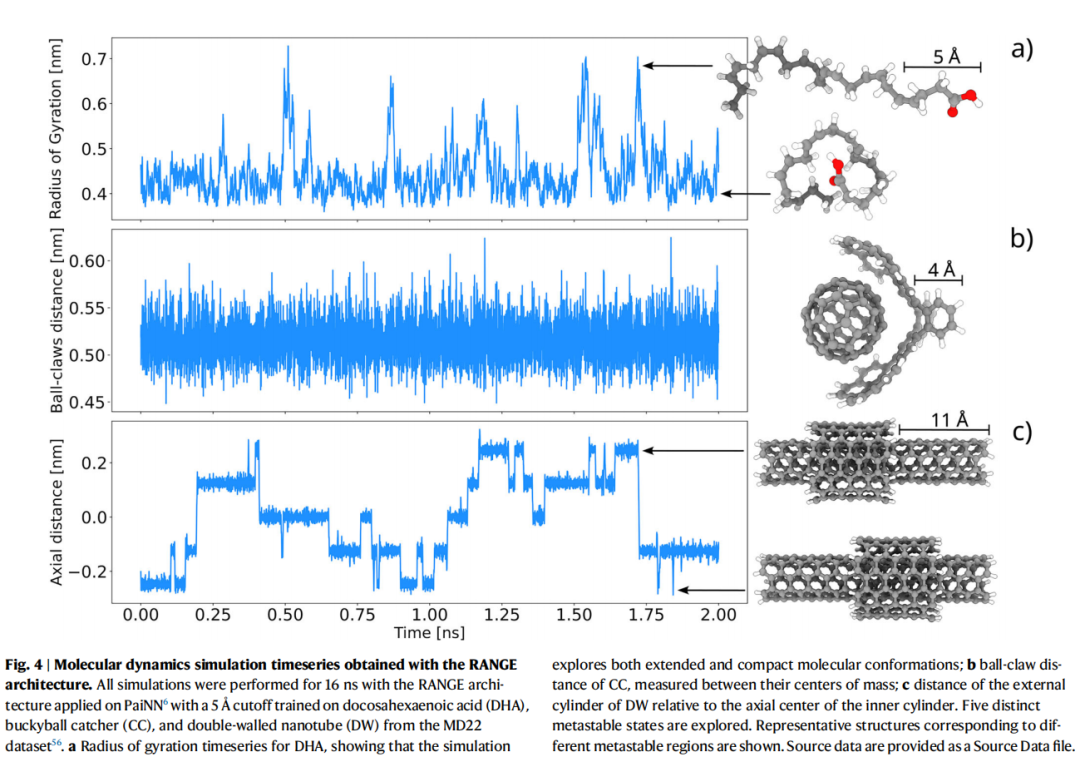 以 PaiNN + RANGE(5 Å 截断)为力场,在气相条件下进行 MD 模拟: