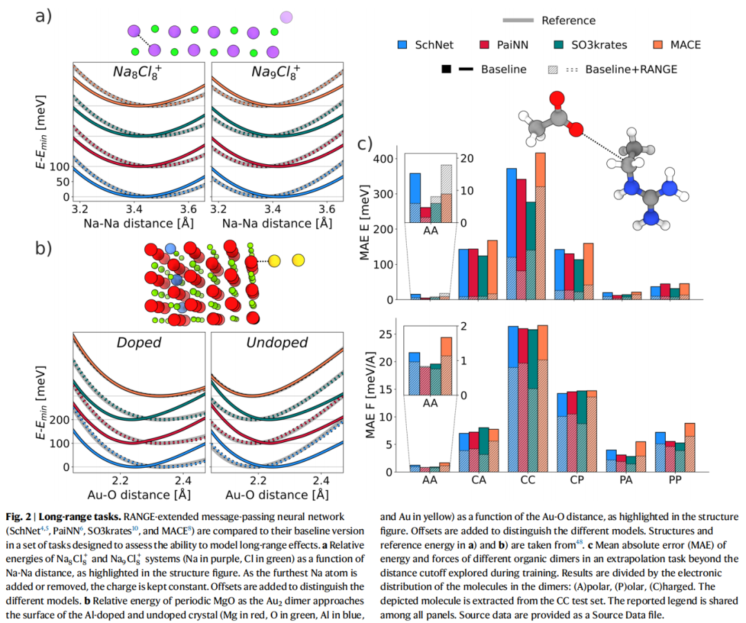 所有模型均采用 2 个交互层、5 Å 截断半径的统一配置进行长程任务测试,以排除感受野扩展带来的混淆效应。