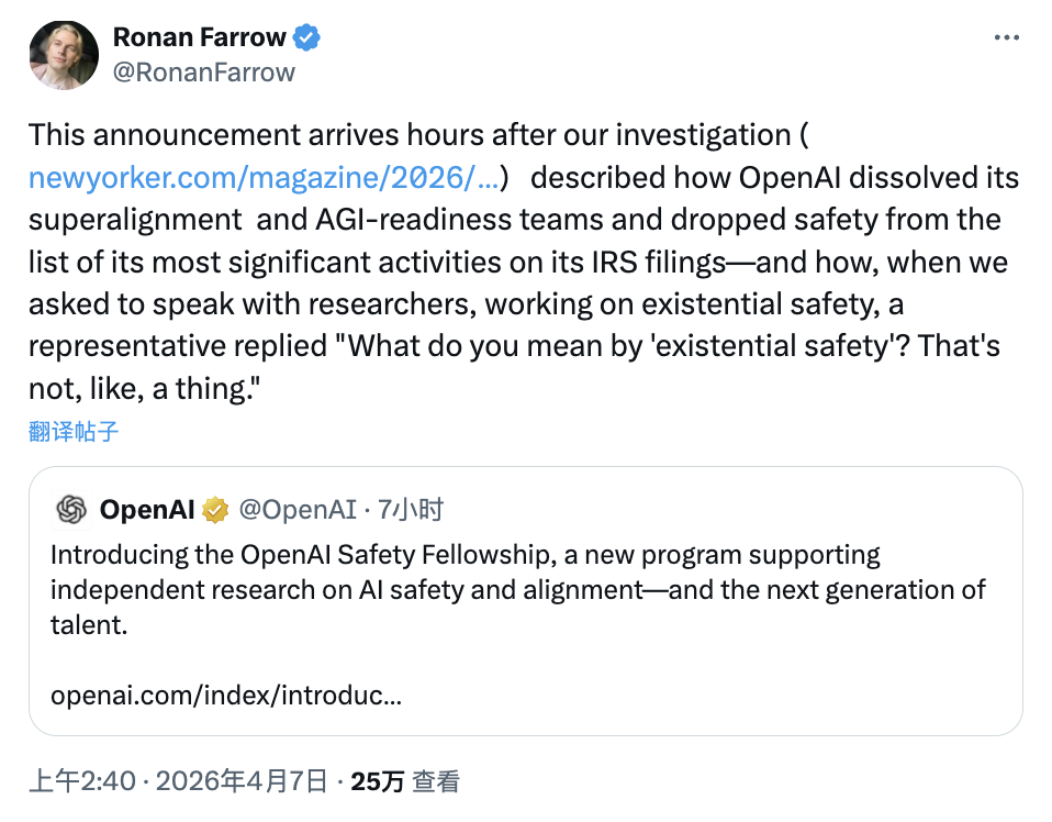 就在刚刚,曝光此备忘录的《纽约客》记者在x上表示,当他们想采访“研究AI生存风险”的研究员时,OpenAI官方回应是: