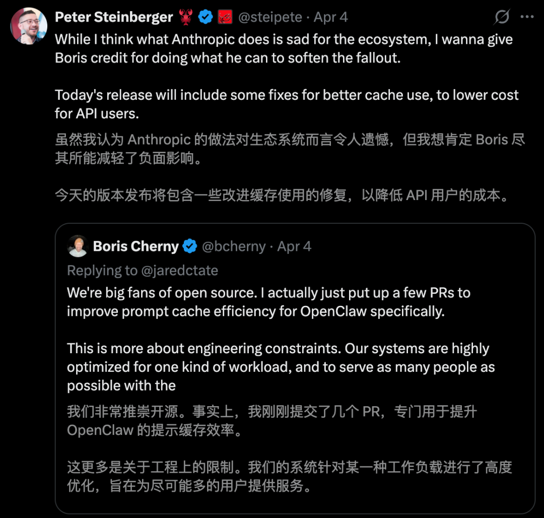 CC之父Boris Cherny对此做出了解释,第三方工具绕过了Claude Code的提示词缓存优化,一个OpenClaw重度用户消耗的算力远超同等规模的Claude Code会话。