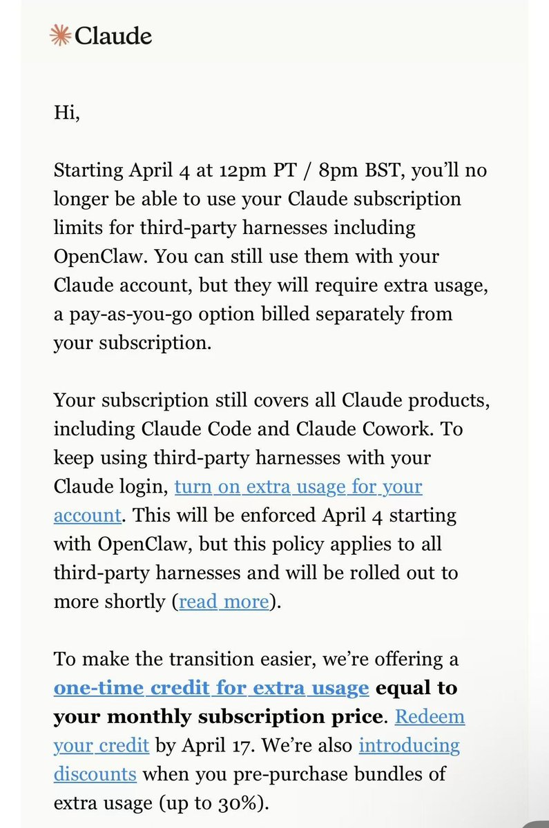 4月4日中午12点(太平洋时间),Anthropic向所有用户发送邮件,宣布Claude Pro和Max订阅将不再覆盖OpenClaw等第三方工具的使用。