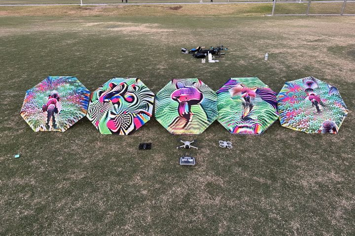 图1: FlyTrap物理对抗性雨伞以及测试的三款商用无人机