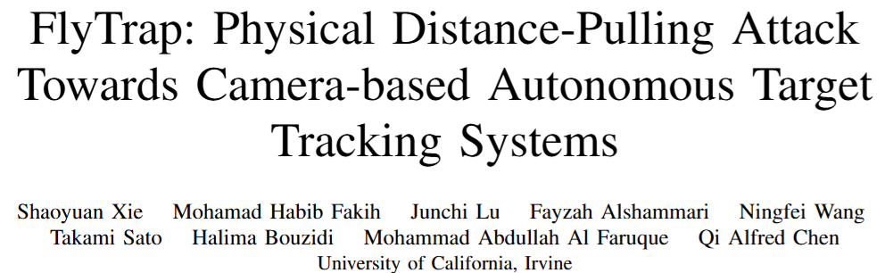 论文链接 (NDSS):https://www.ndss-symposium.org/ndss-paper/flytrap-physical-distance-pulling-attack-towards-camera-based-autonomous-target-tracking-systems/