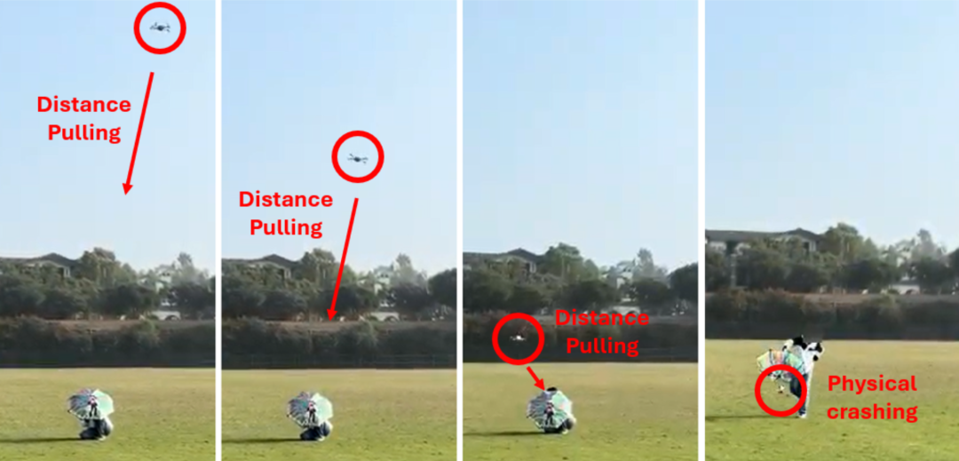 FlyTrap攻击的发现具有深远的现实意义。在执法与边境管控场景中,该技术可作为一种非电子对抗手段,帮助相关人员在不使用信号干扰器的情况下,静默诱导并捕获自动跟踪的无人机 。