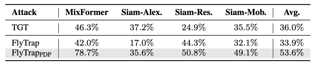 研究人员在四款主流开源跟踪算法上系统评估了FlyTrap的攻击效果,使用平均攻击成功率(mASR)作为核心指标。结果如下表所示: