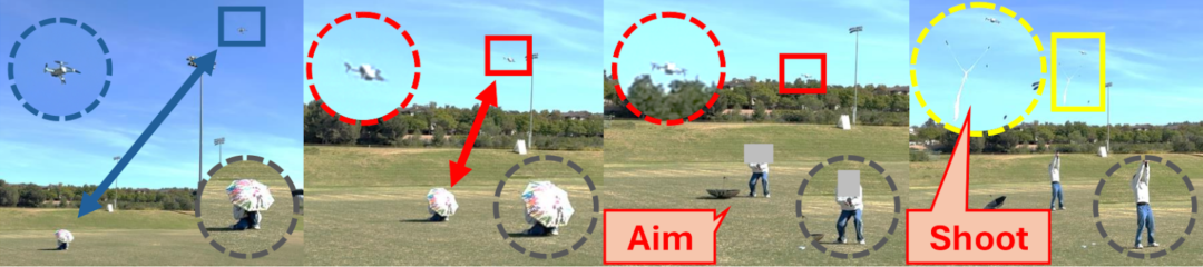 图6: 第一人称视角FlyTrap攻击DJI Mini 4 Pro,单目标跟踪算法被对抗性雨伞图案误导
