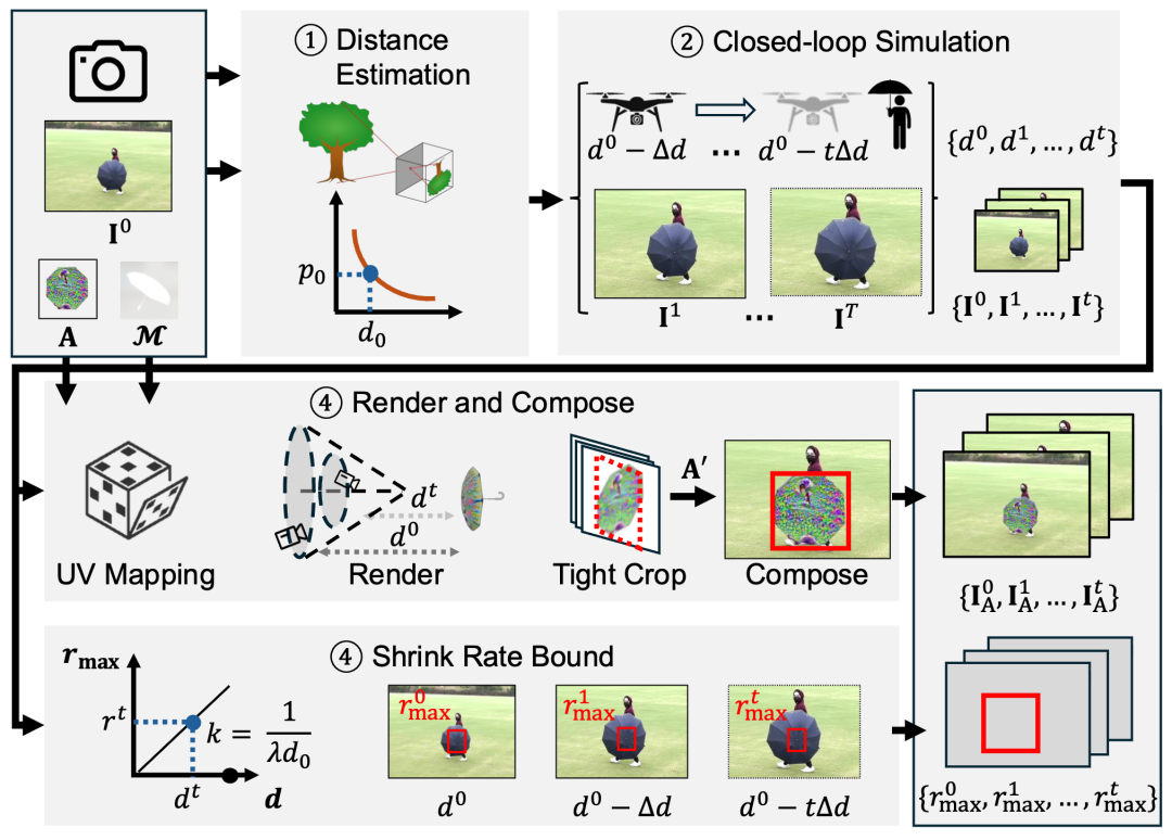 渐进式闭环模拟(PDP): 传统的对抗攻击往往只针对单帧静止图像,而 FlyTrap 面对的是持续逼近的动态控制闭环。为此,研究人员提出了渐进式距离拉近(Progressive Distance-Pulling, PDP)优化策略:在生成对抗图案时,模拟无人机从初始距离d0逐步逼近至