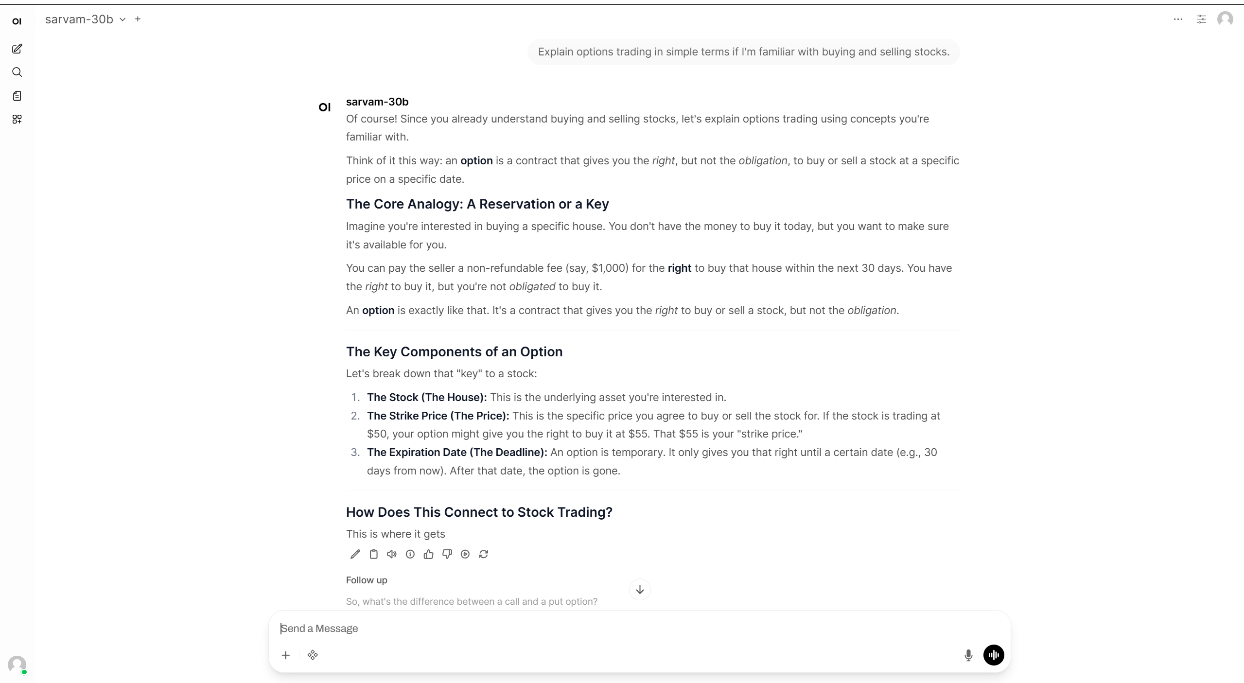 Sarvam-30B 是由 Sarvam AI 于 2026 年 3 月推出的开源大语言模型。作为 Sarvam 最新开源模型系列中的 30B 版本,它采用 Mixture-of-Experts(MoE)架构,总参数规模为 30B、每 token 激活参数约为 2.4B,面向多语言对话、推理、编码与实际部署场景进行了系统优化。
