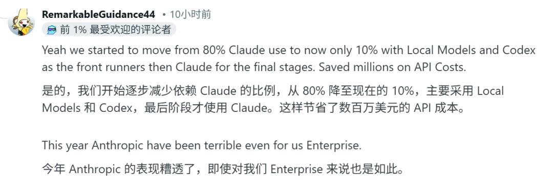 有的团队,已经将Claude比例从80%降至20%,在核心逻辑阶段转向更稳定省钱的本地方案,直接导致API成本下降数百美元。