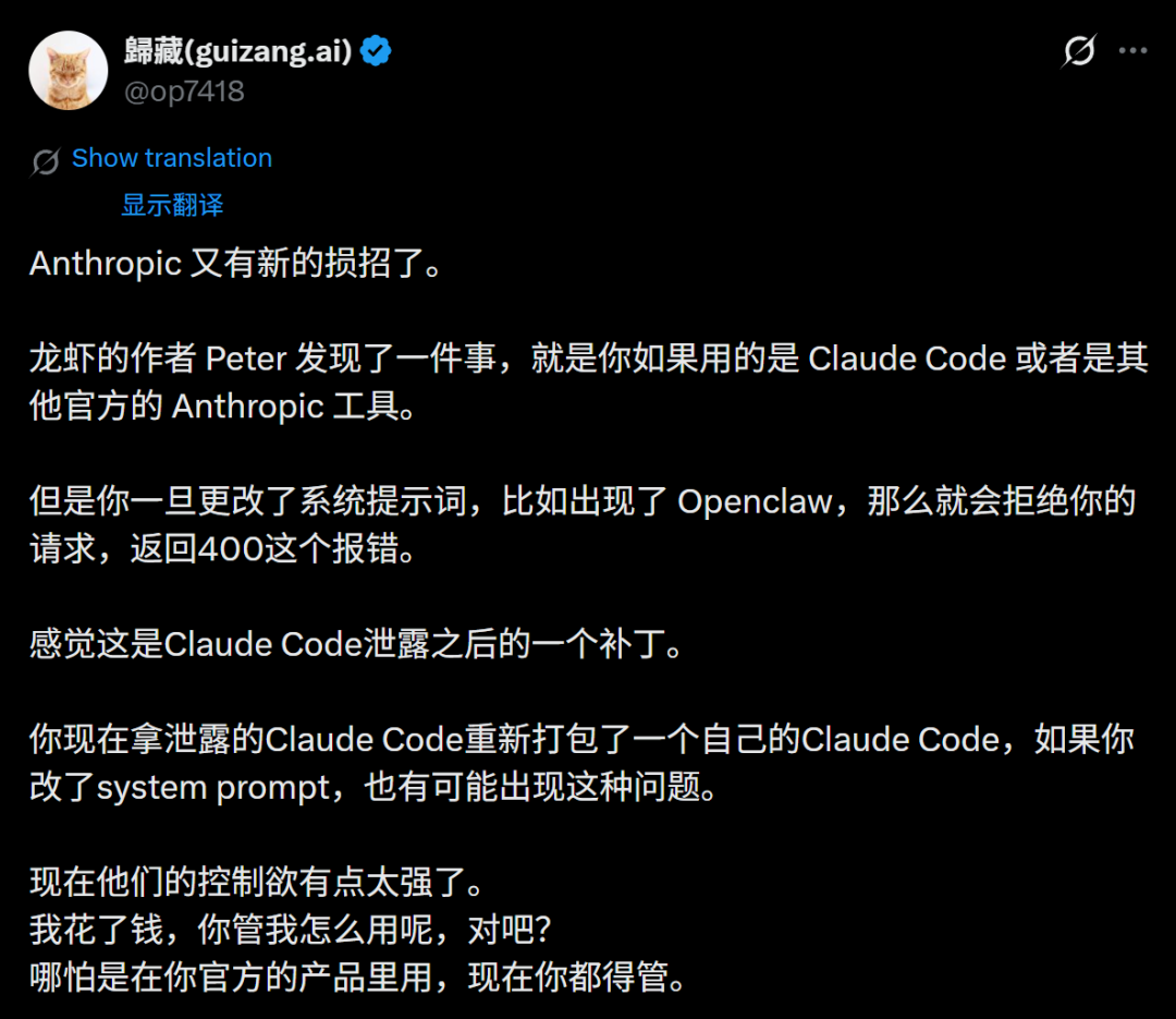 龙虾之父Peter Steinberger爆料说,Anthropic开始对「自定义系统提示词」痛下杀手了!