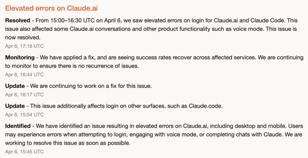 北京时间4月7日凌晨01:16,Anthropic宣布已解决该问题,但没有解释故障原因。