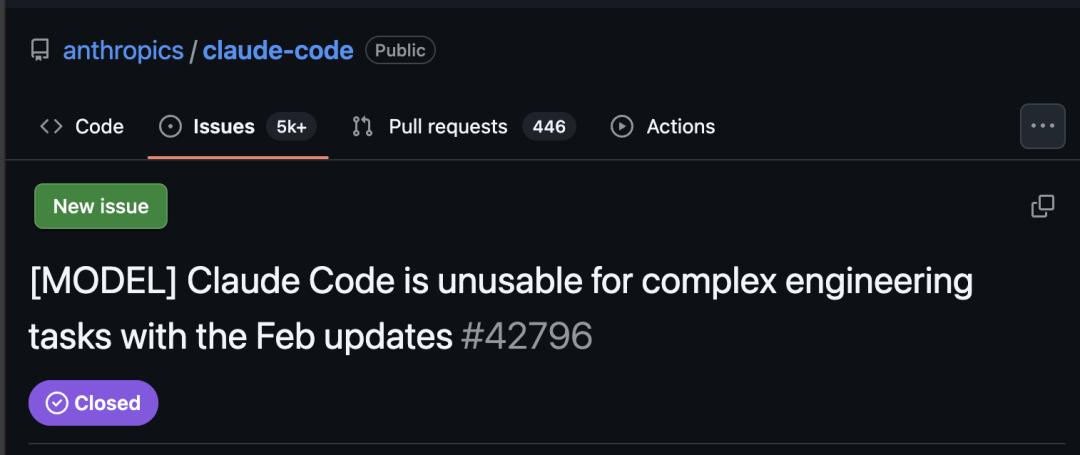 另外,还有开发者在GitHub提交Issue,直指Claude Code在2月份更新后性能严重下降,在处理复杂工程任务时会完全「失常」,输出不稳定,频繁偏离需求,甚至不可用。