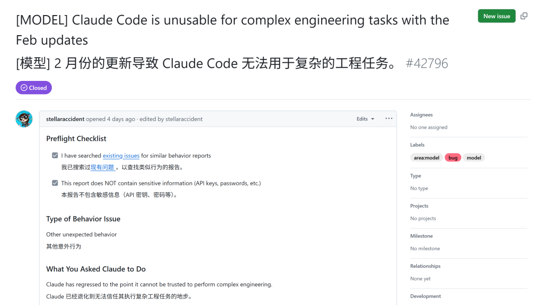 在GitHub上,有开发者控诉:在2月更新后,Claude Code已无法胜任复杂工程任务了。