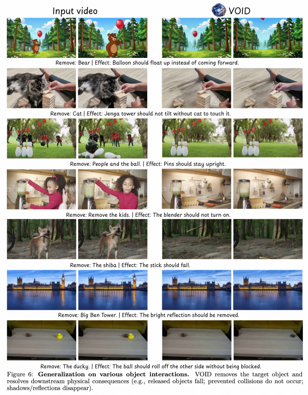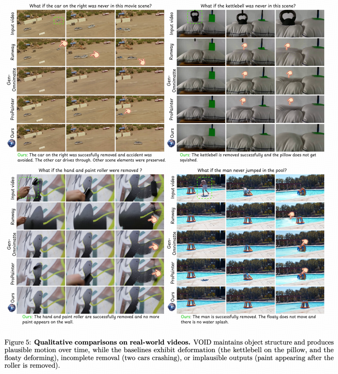 同时,VOID也展现出了对训练数据中未出现过的物理效果的泛化能力,比如“移除拿气球的熊后气球会飘走”,“移除按搅拌机按钮的人后搅拌机不会启动”,这说明VOID并非简单记忆训练样本,而是学会了利用底层模型的物理直觉进行推理。