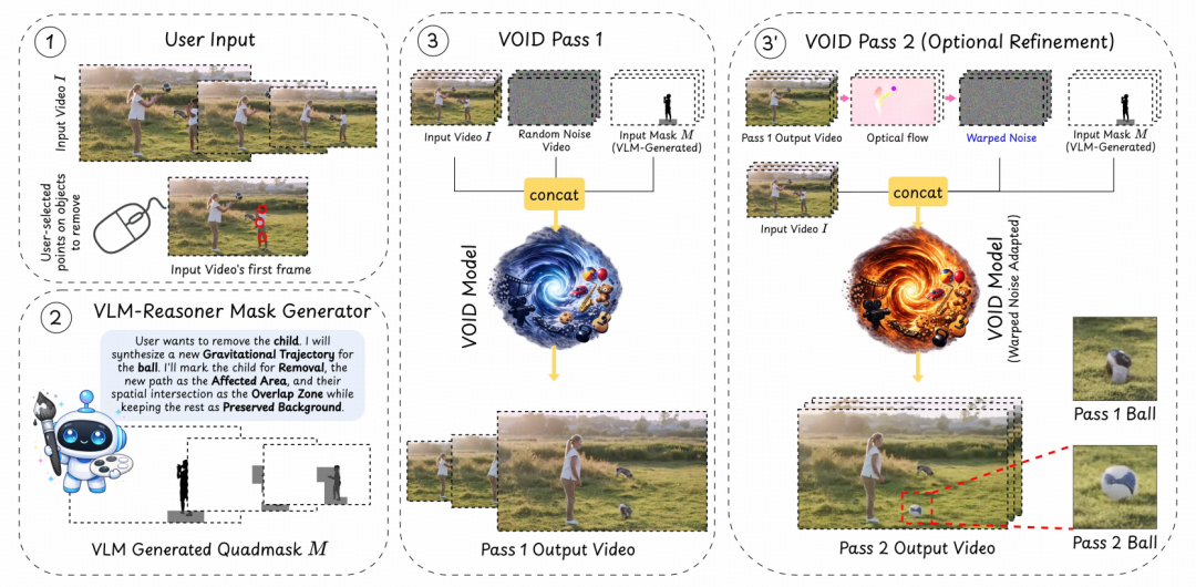 VOID的整体流程如下:用户提供一段视频并指定要移除的物体,系统自动推理哪些区域会因该物体的消失而发生变化,然后生成一段物理上合理的反事实视频。