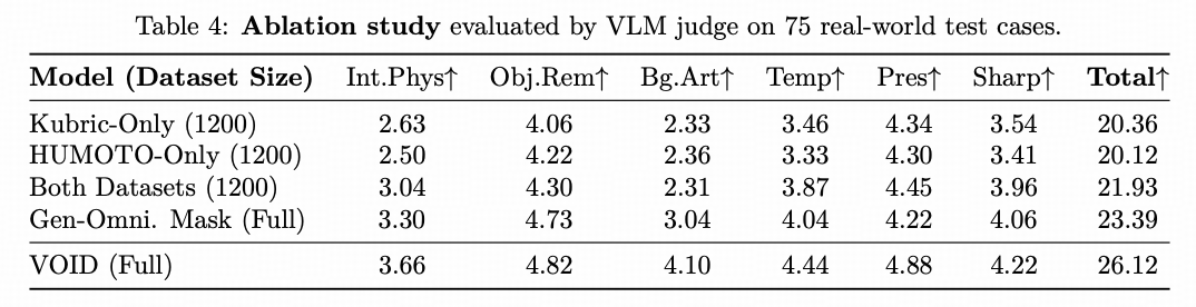 例如,VOID在除LPIPS外的所有指标上均为最佳。值得注意的是,LPIPS对局部位移敏感——如果模型正确模拟了物体掉落但速度略有偏差,反而可能比直接删除物体的模型得分更低。在视频级指标FVD和VLM裁判分数上,VOID与基线的差距最为显著,有力证明了其在物理合理性和语义一致性方面的优势。