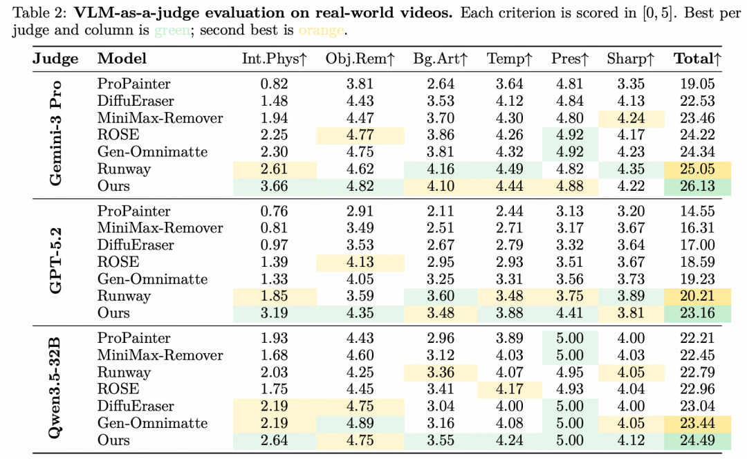 VLM裁判评估:研究团队使用Gemini 3 Pro、GPT-5.2和Qwen 3.5-32B三个VLM作为自动裁判,从交互物理、物体移除、时序一致性、场景保留等维度进行评分。在所有三个裁判的评估中,VOID均获得SOTA总分。其中“交互物理”维度的优势更为明显,在Gemini 3 Pro评估中,VOID得分3.66,而第二名Runway仅2.61。