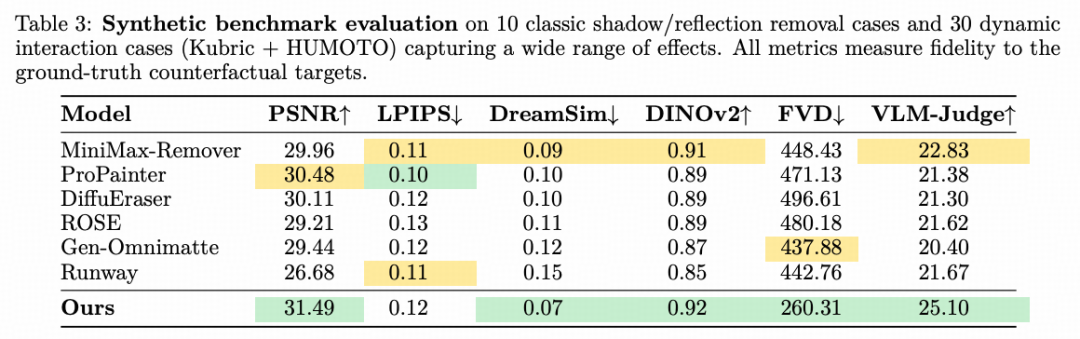 在包含10个经典影子 / 倒影移除案例和30个动态交互案例的合成基准上,VOID也展现出了SOTA能力。