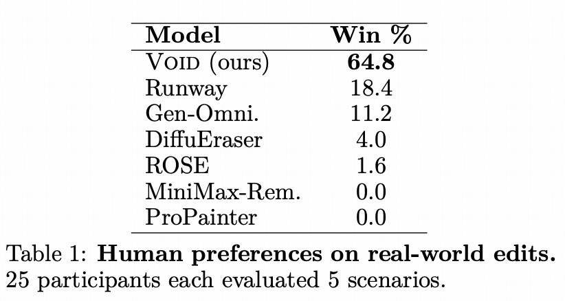 人类偏好研究:25名参与者各评估5个场景,从7个模型的输出中选择最佳结果。结果显示,VOID以64.8%的胜率取得了SOTA结果,即使Runway额外接受了描述预期场景变化的文本指令。
