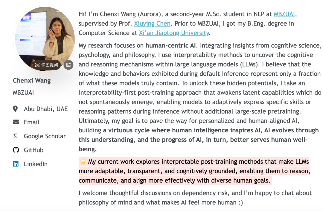 论文一作Chenxi Wang,MBZUAI(穆罕默德·本·扎耶德人工智能学院)的NLP硕士研究生,本科毕业于西安交通大学计算机科学专业。