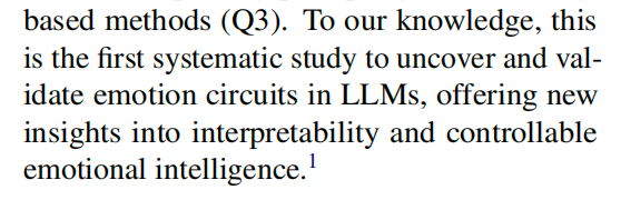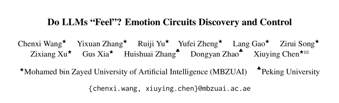 Chenxi Wang团队的论文《“LLMs 会“感觉”吗?情绪回路的发现与控制》,研究了驱动语言模型产生情绪输出的内部机制。